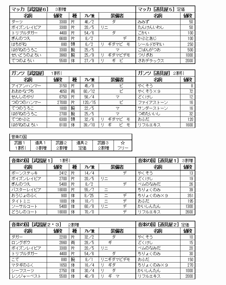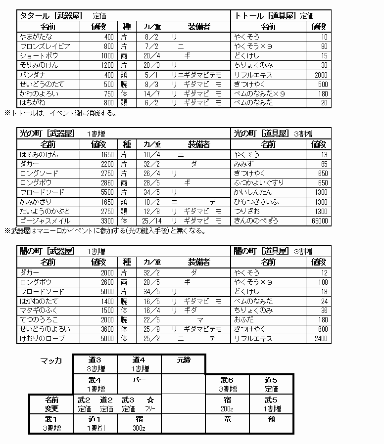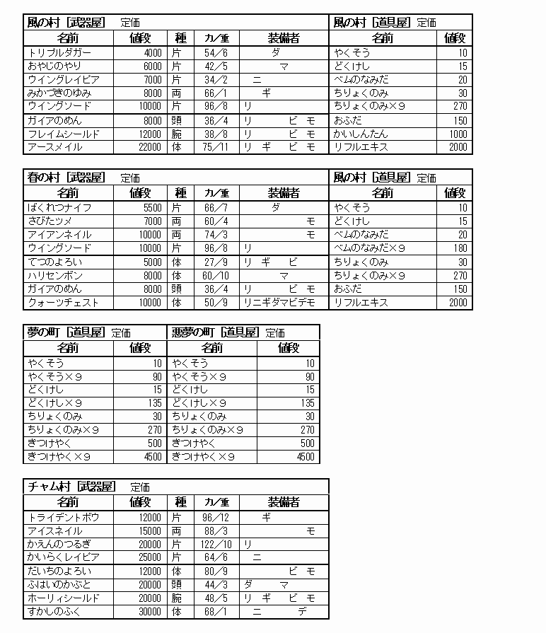 装備者は、リ:リュウ/ニ:ニーナ/ギ:ギリアム/ダ:ダンク/ マ:マニーロ/ビ:ビルダー/デ:ディース/モ:モグ です。
