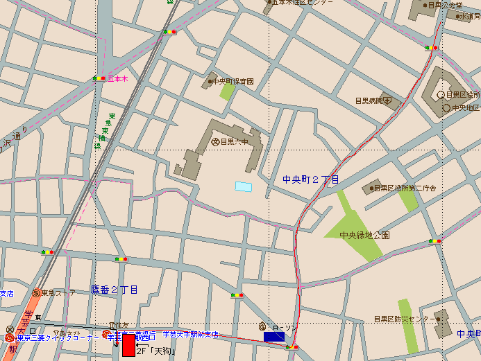 赤矢印が「目黒区公会堂からのルート」、
