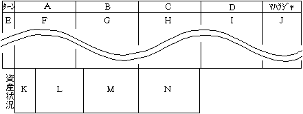 このような罫線を用紙いっぱいに書きます。その際、F〜Iの欄は等間隔で取り、Jの欄はF〜Iより少し狭目に取りましょう。なお、A〜Nの欄に書く内容は次の通りです。